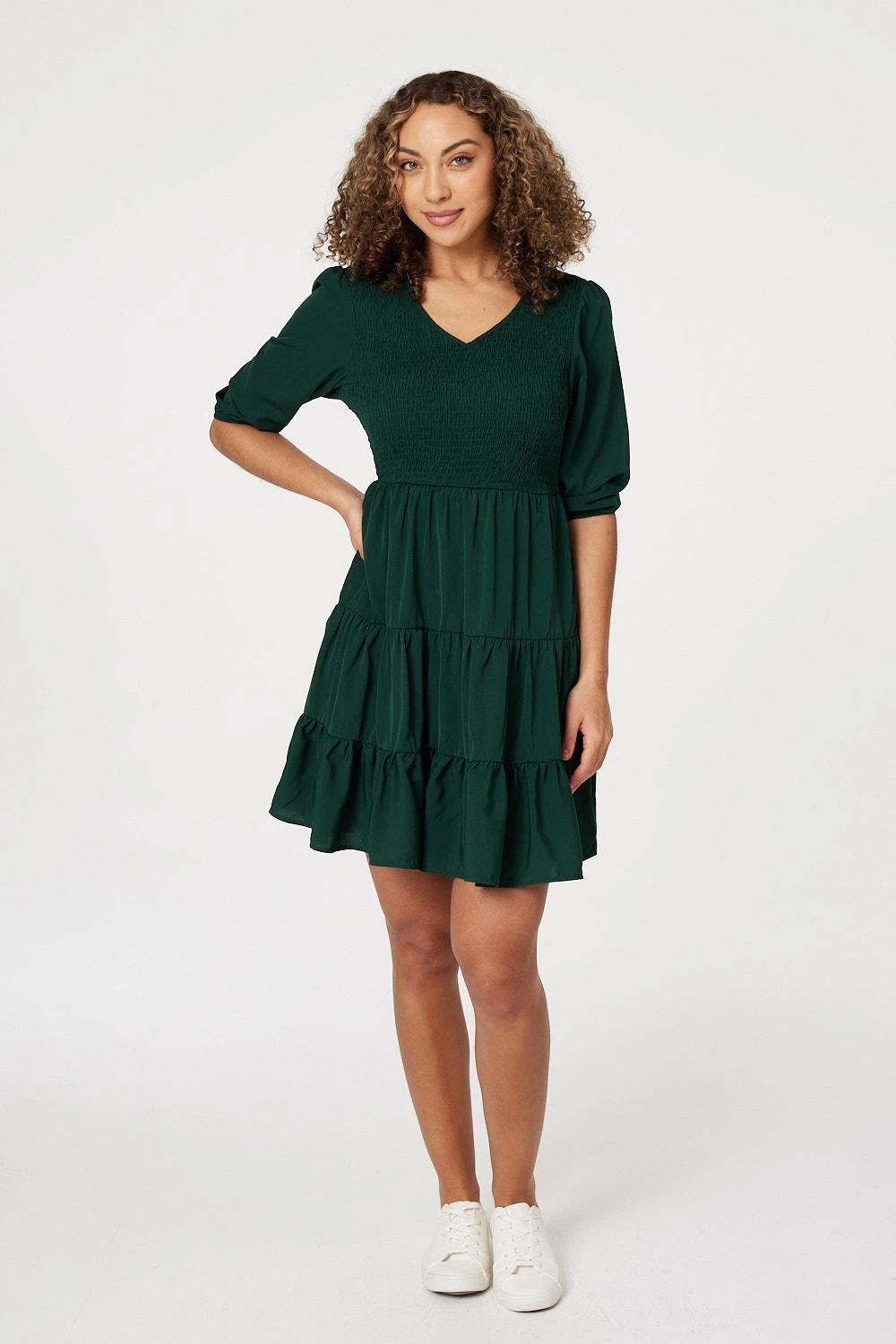 Every capsule wardrobe needs comfortable go-to smock dress like this one. With a v-neck, smocked bodice, 1/2 sleeves and a tiered short skirt. Pair with fresh white trainers and a denim jacket for an elevated weekend style.
