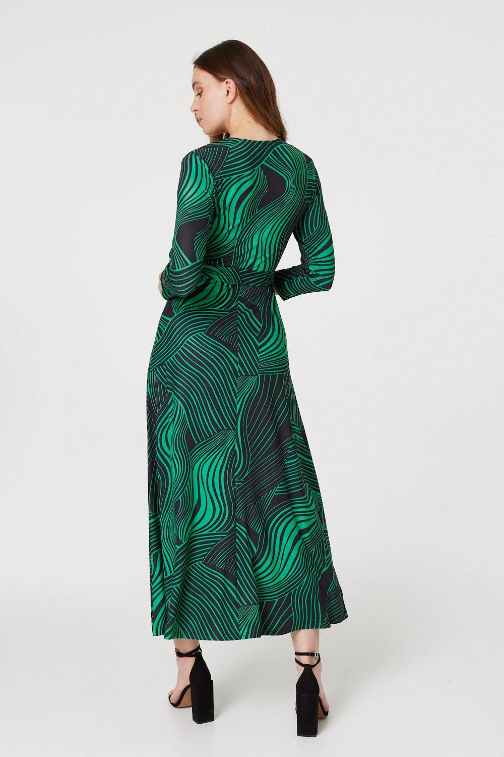 Make a statement in this vivid printed maxi dress. It has a deep v-neck, wrap front, detachable self-tie belt, 3/4 sleeves and a sleek a-line maxi length skirt. Made from a non-iron stretch jersey fabric, it’s a great grab-and-go outfit. Pair with neutral heels for a look that’s perfect for almost any occasion from daytime to evening.