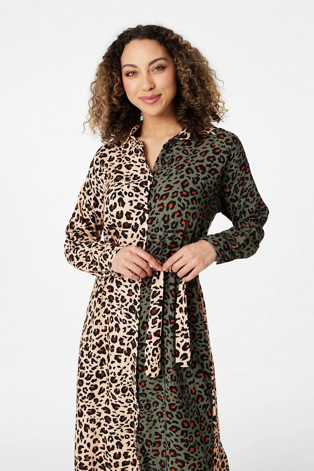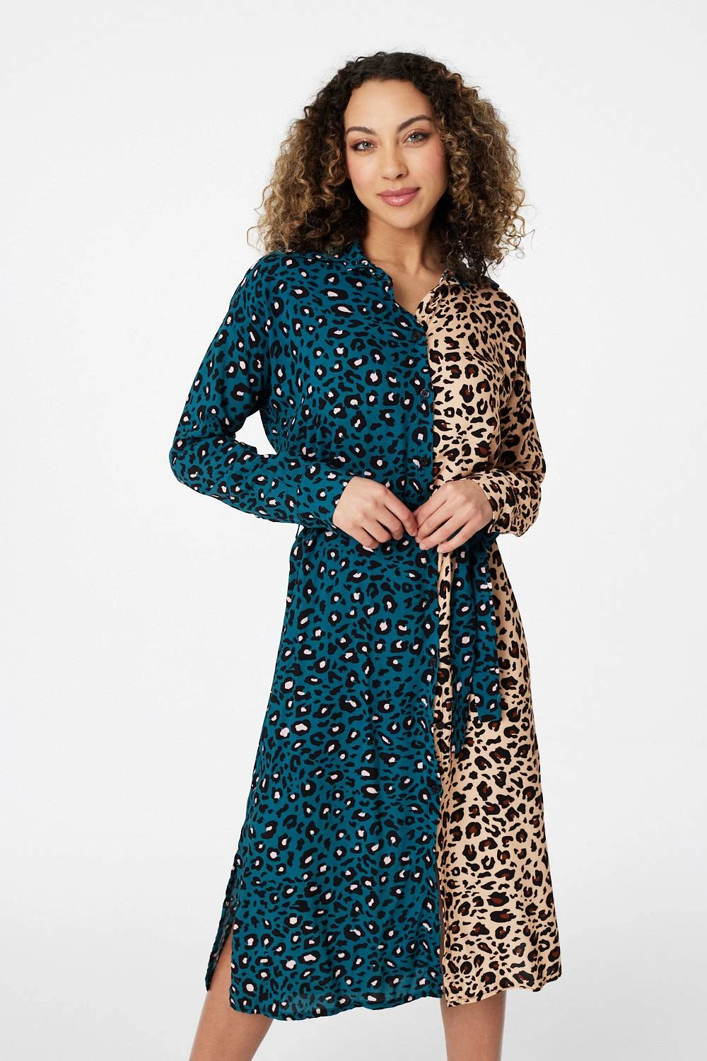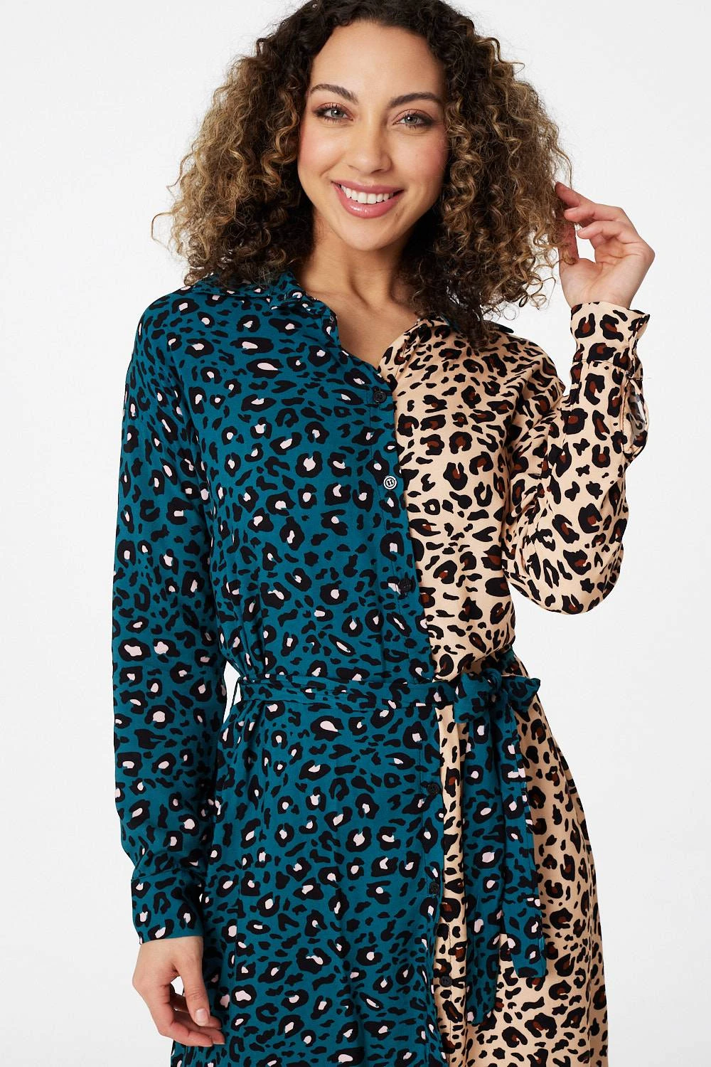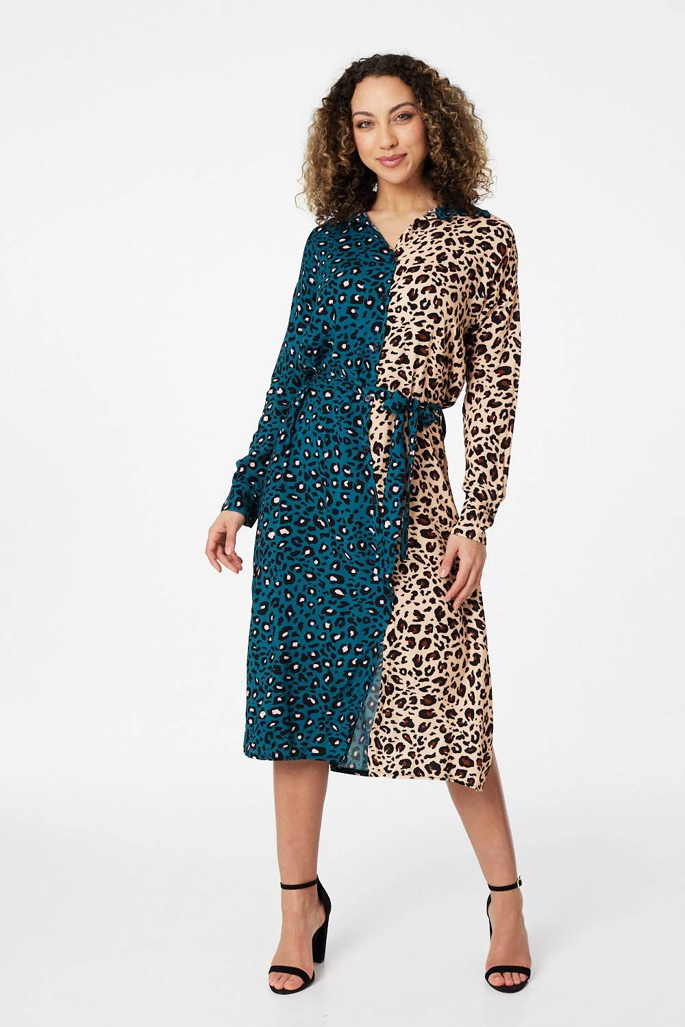 Make a statement in this animal print colour block skirt dress. With a v-neck, classic collar, button front, long sleeves, a removable tie detail belt and a midi skirt. Pair with black strappy heels for a chic dinner date outfit.