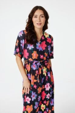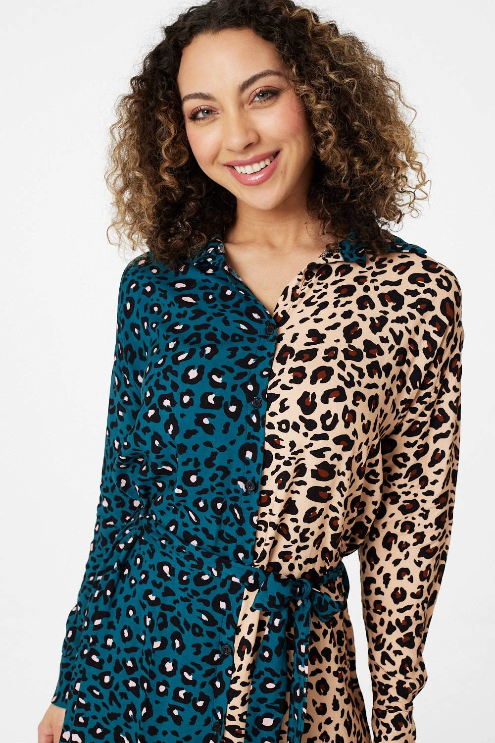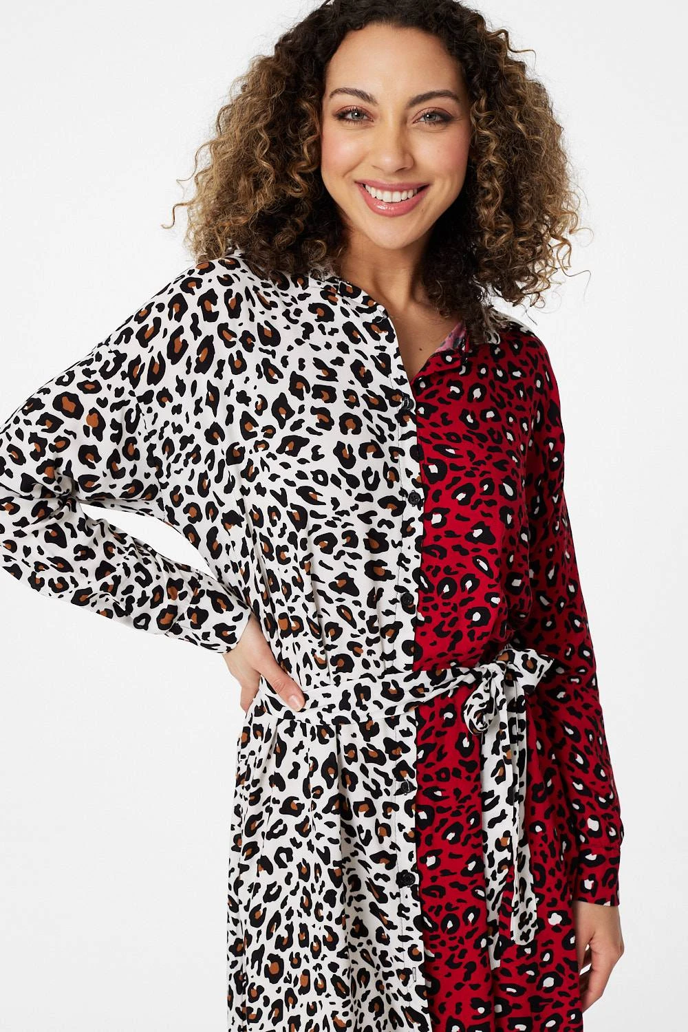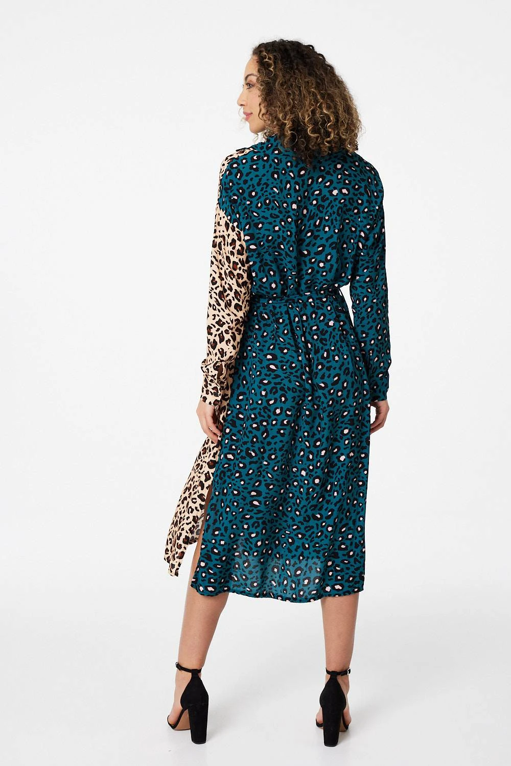 Make a statement in this animal print colour block skirt dress. With a v-neck, classic collar, button front, long sleeves, a removable tie detail belt and a midi skirt. Pair with black strappy heels for a chic dinner date outfit.