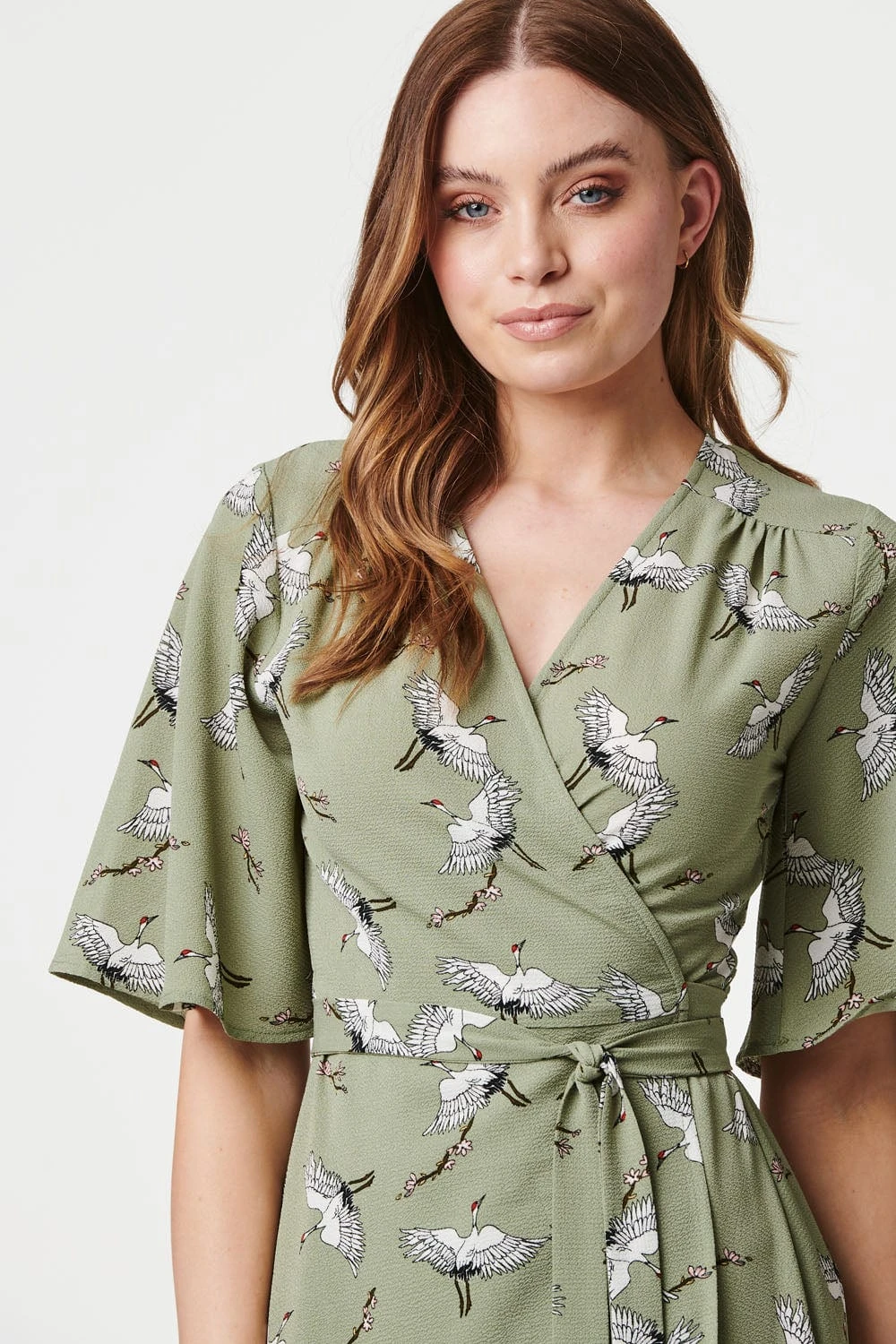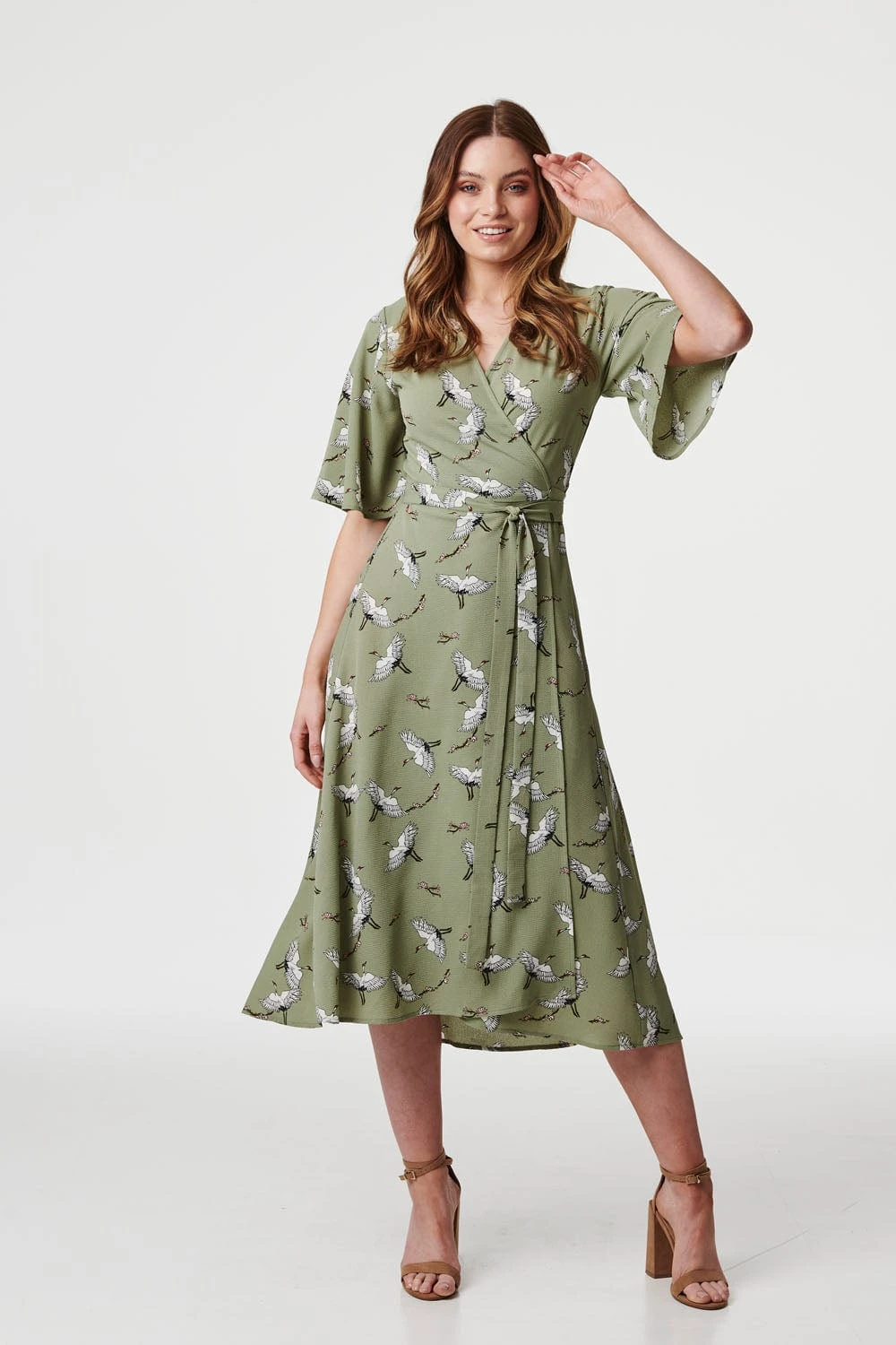 Make a chic statement in this bird print wrap dress. With a deep v-neck, a wrap front, short flared sleeves, a tie detail waist and a midi length skirt. Pair with blush heels for a stylish wedding guest look.