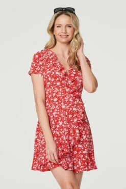 Your everyday dress collection needs this ditsy print tea dress. With a v-neck, short frilled sleeves, a flattering waist-cinching tie front and a frilled detail curved midi skirt. Style with silver heels for a polished evening occasion or dress down with flat sandals.
