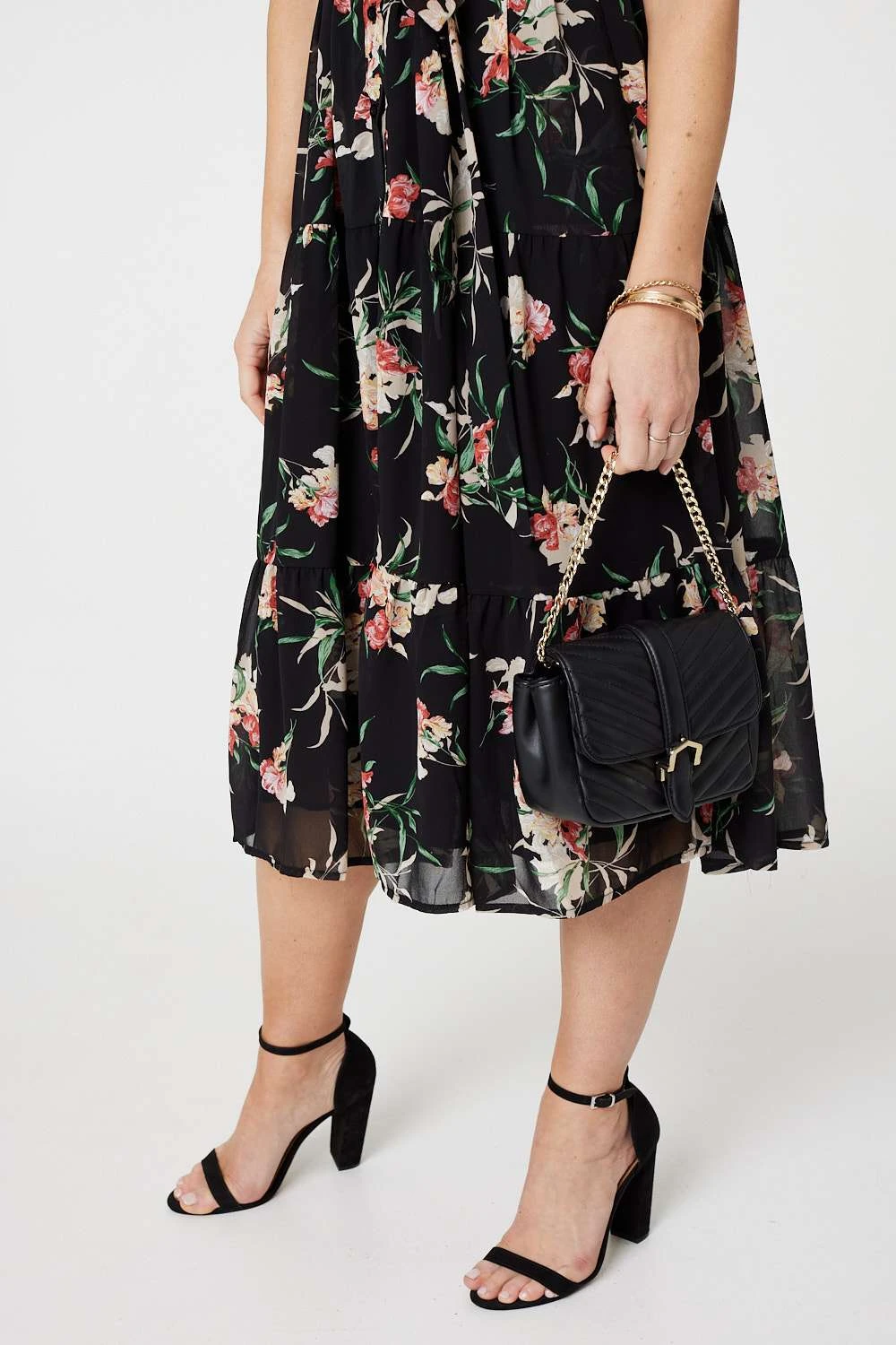 Add a bold floral shirt dress to your closet with this midi look. With a classic collar, a button front, sheer cap sleeves, a tie detail belt and an a-line midi skirt. Style with black heeled wedges for a chic holiday ready outfit.