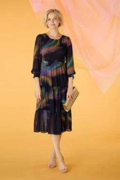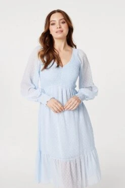 Every capsule wardrobe needs a go-to tea dress like this one. It has a v-neck, short angel sleeves, a button front, detachable self-tie belt, and a midi length skirt with a pretty flare detail. Pair with neutral heels for a sophisticated daytime style.