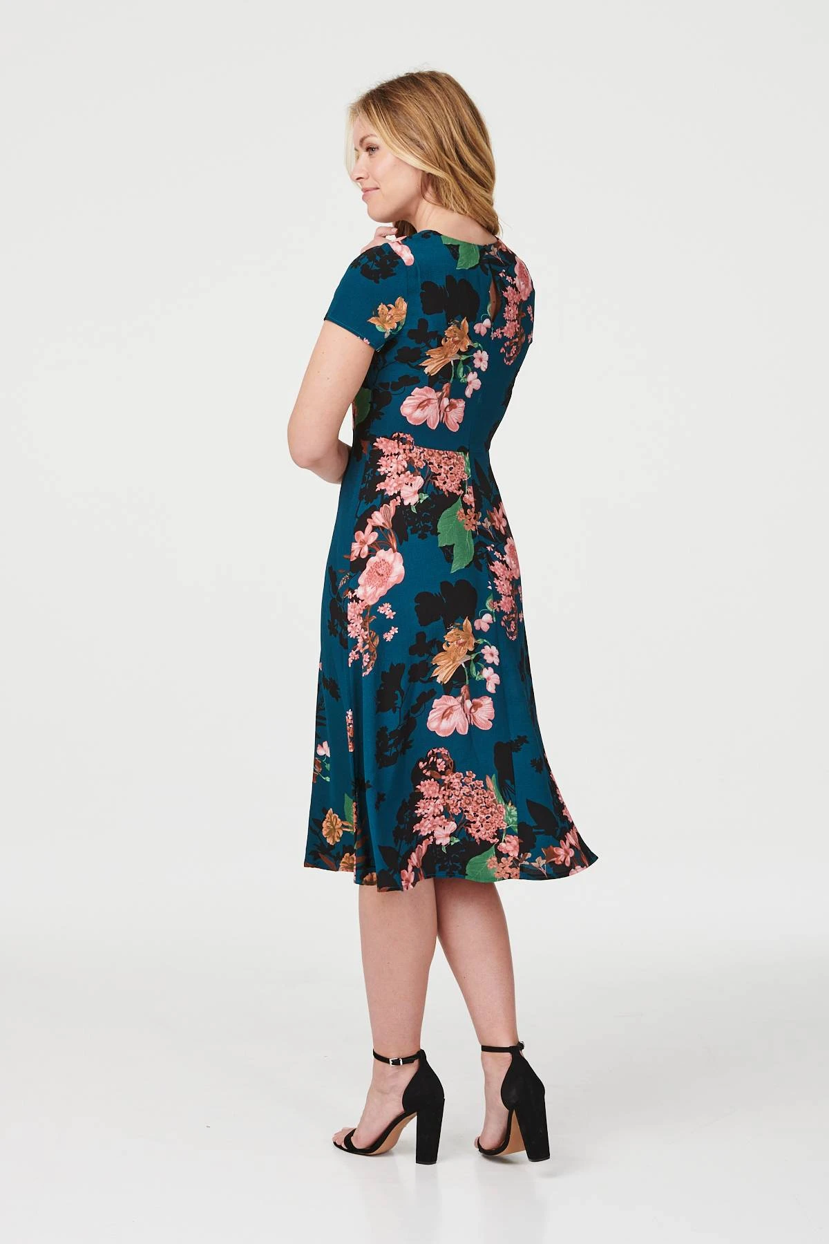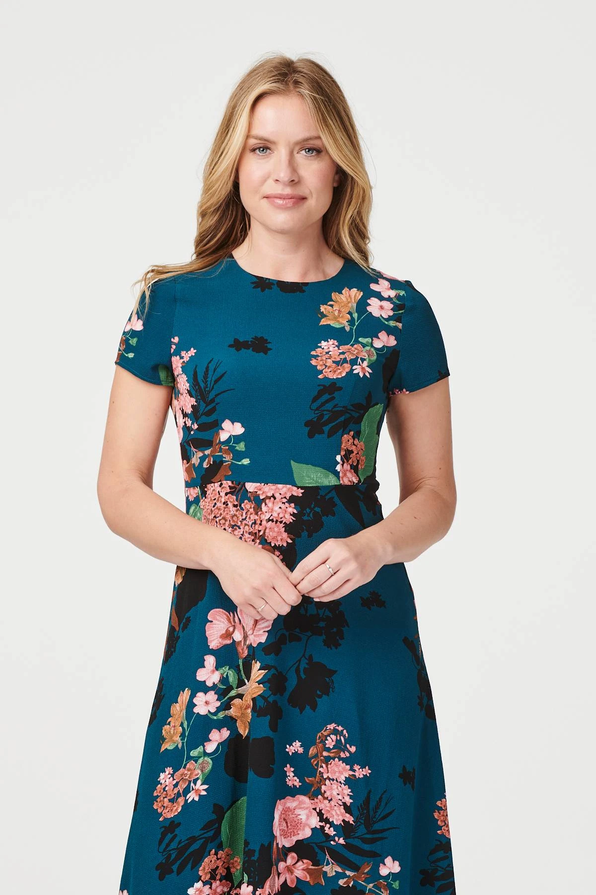 Add a flattering everyday dress to your closet with this floral midi dress. With a round neck, short sleeves, a keyhole and button back and a midi length a-line skirt. Style with high heels and a white blazer for a chic wedding guest look or swap your heels for sandals for a polished office friendly outfit.