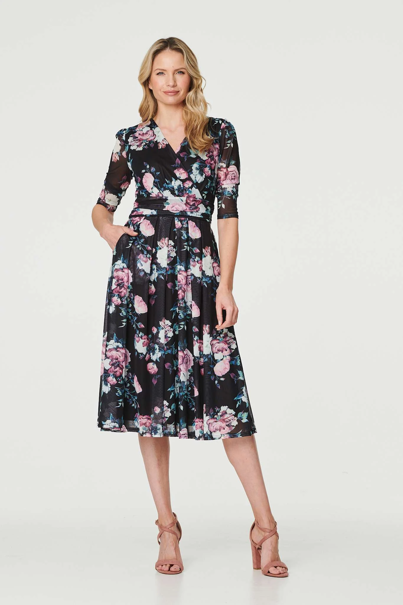 Heading out to a formal event? Look sophisticated and feel confident in this beautiful wrap dress with semi sheer 1/2 sleeves, pockets, a pleated midi skirt and a flattering wrap waist panel.