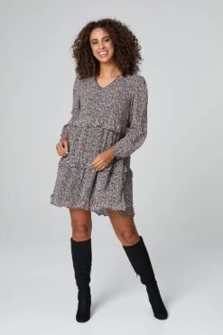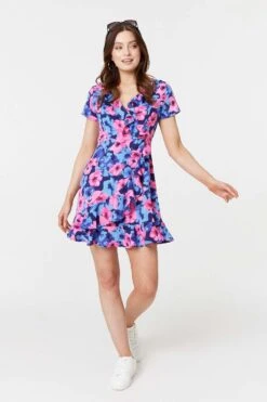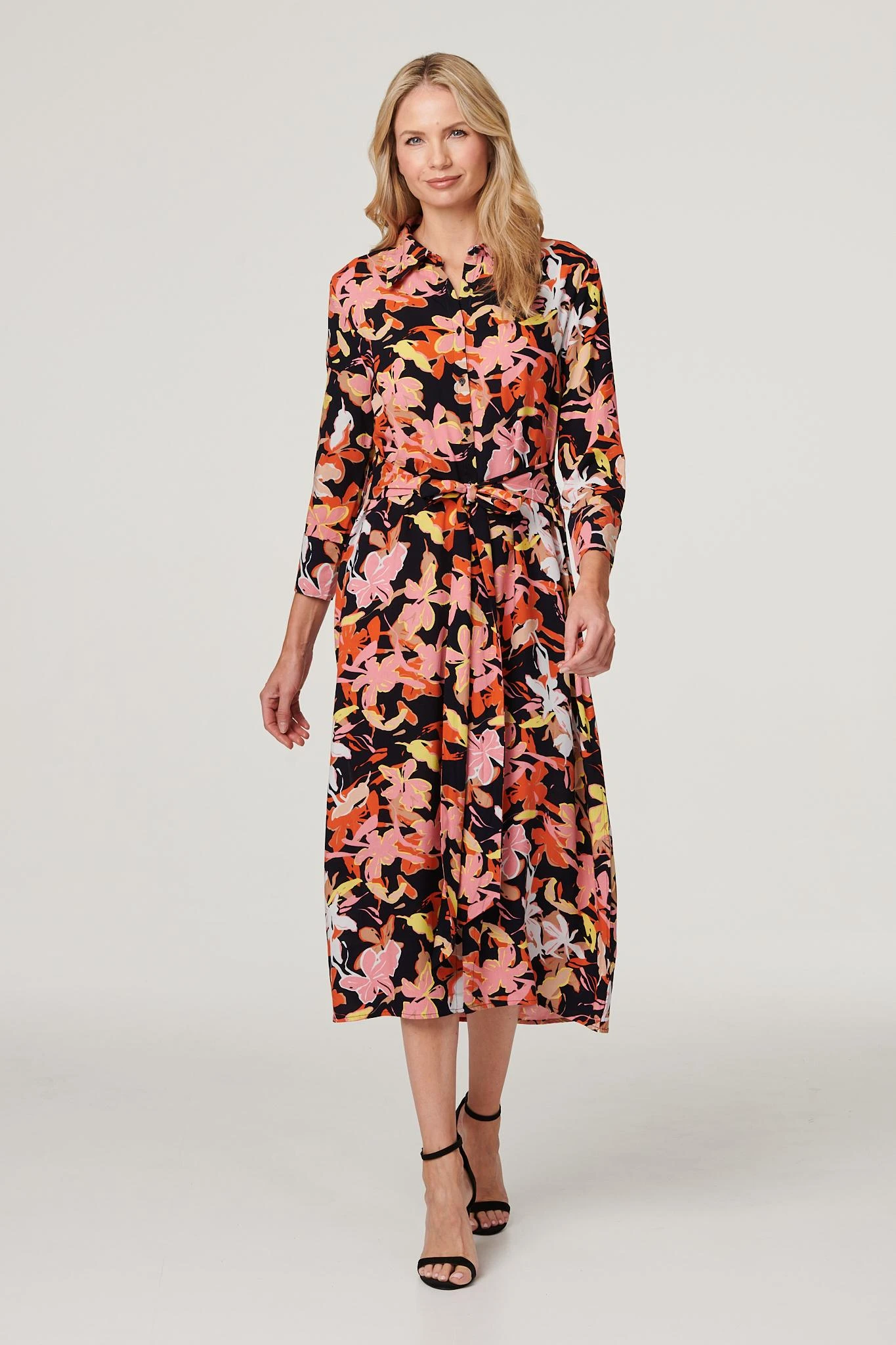Add a tailored style to your dress collection with this floral shirt dress. It has a collar, button front, long sleeves, a self-tie waist and a straight midi length skirt with side splits. Made from 100% viscose, it’s a lightweight and breathable dress you can feel cool and comfortable in on a warm day. Pair with neutral heels for a vibrant daytime look.