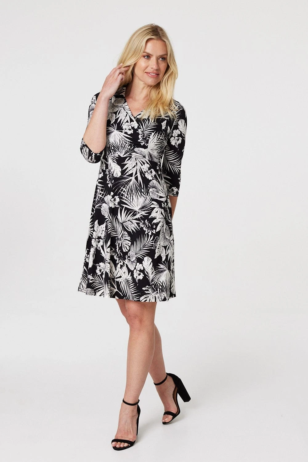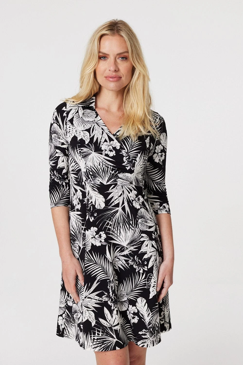 Add a statement leaf print to your wardrobe with this elegant shirt dress. It has a V-neck, collar, wrap front, 3/4 sleeves and a short skater skirt. Made from a soft non-iron jersey fabric, it’s a great grab and go dress to have you looking stylish in seconds! Pair with neutral block heels for a standout warm weather look.