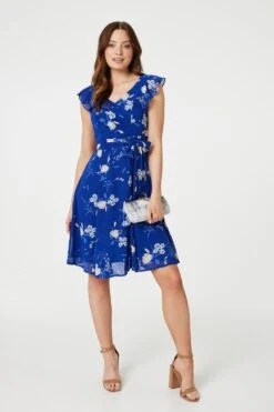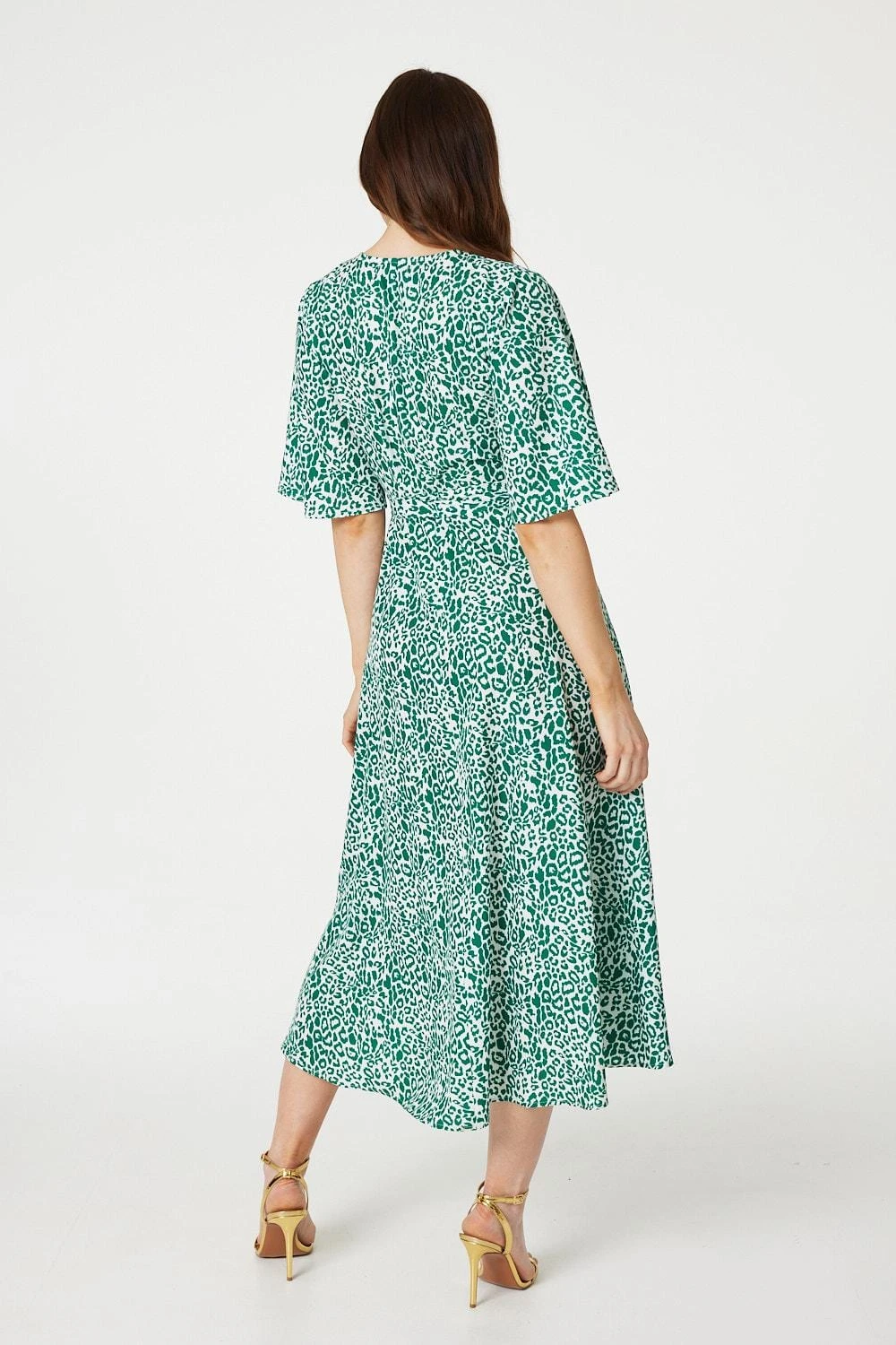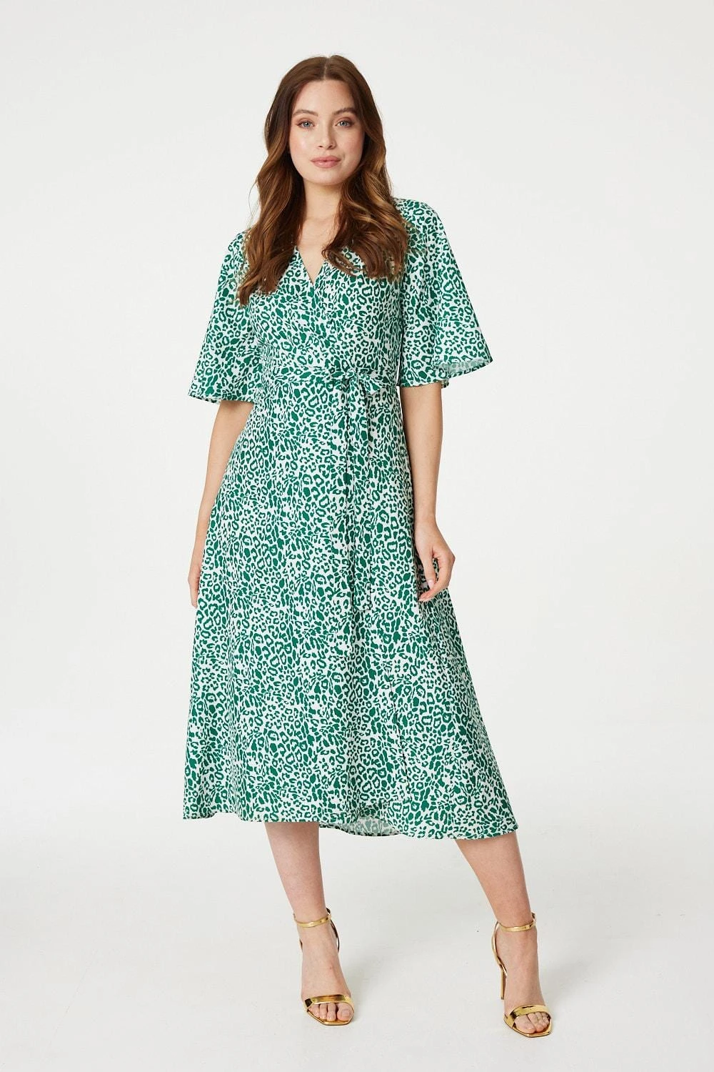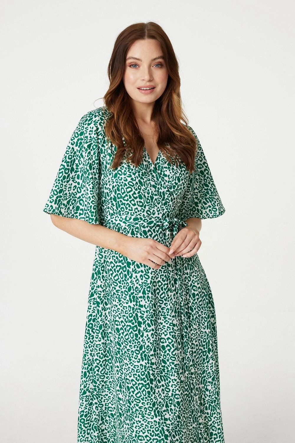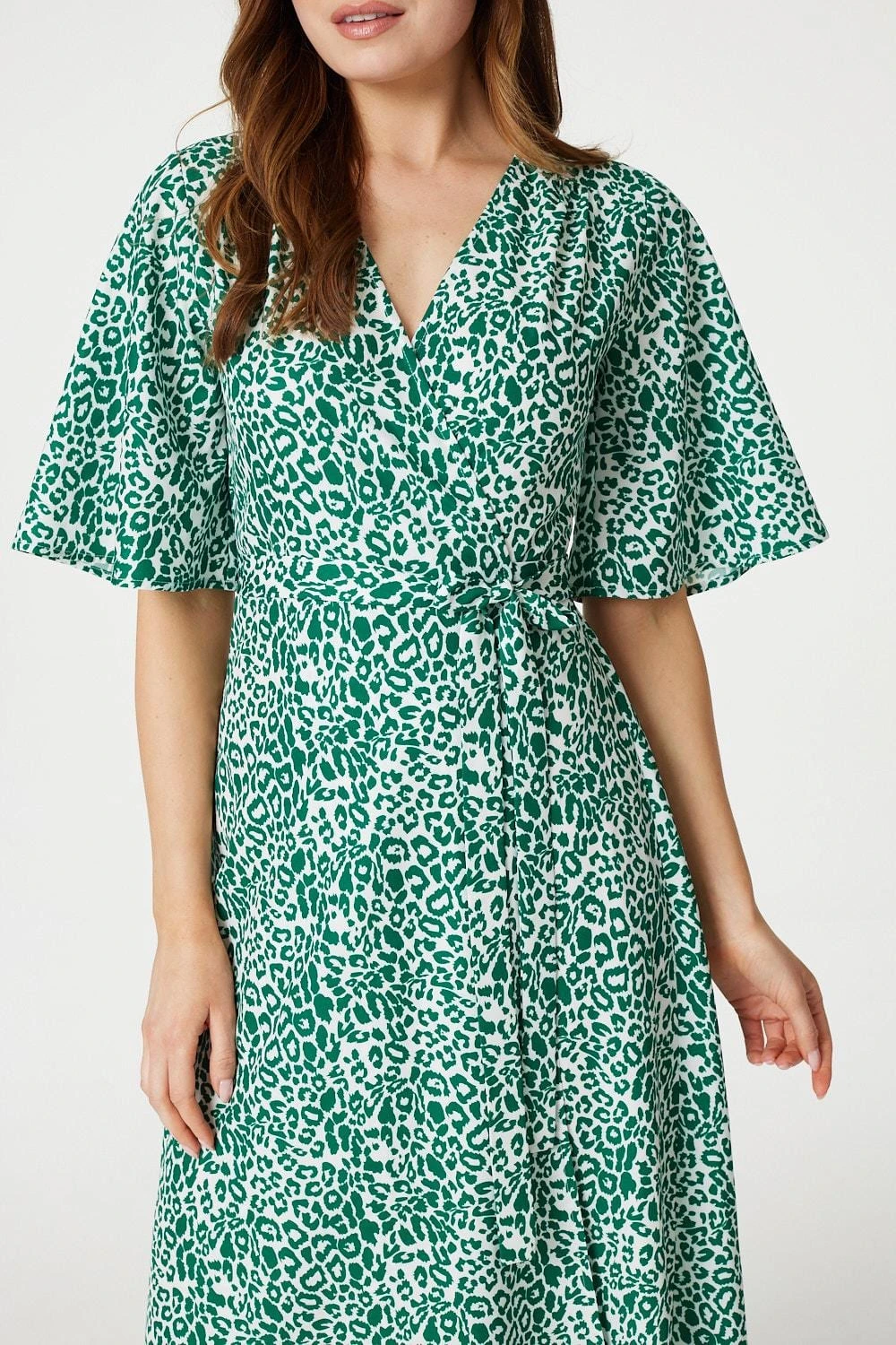 Add a statement animal print to your wardrobe with this leopard print midi. It has a v-neck, wrap front, self tie waist, 1/2 length angel sleeves and an a-line midi length skirt. Pair with neutral heels for an elegant warm weather style that’s great for brunch with friends or a day at the office.