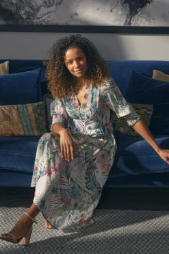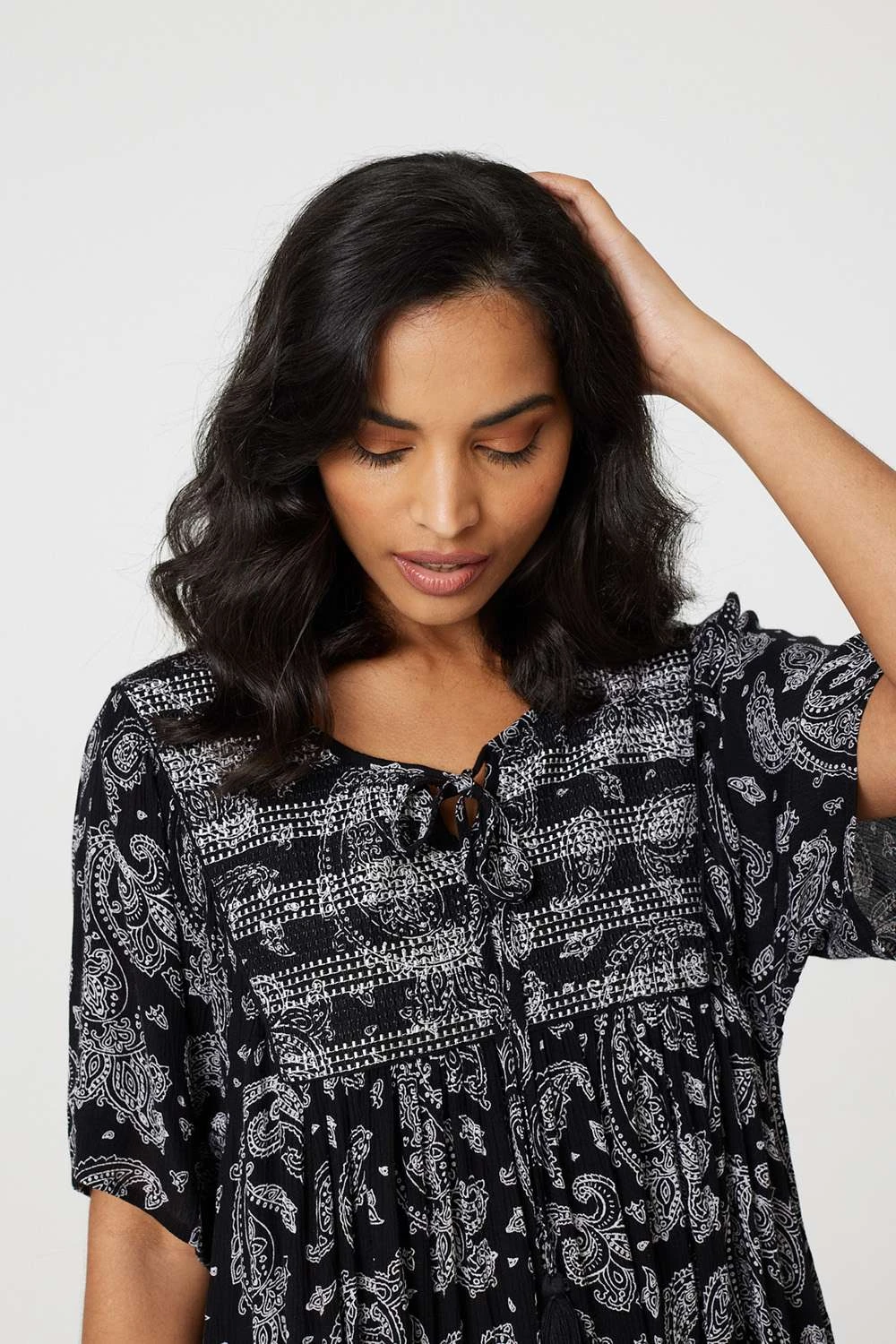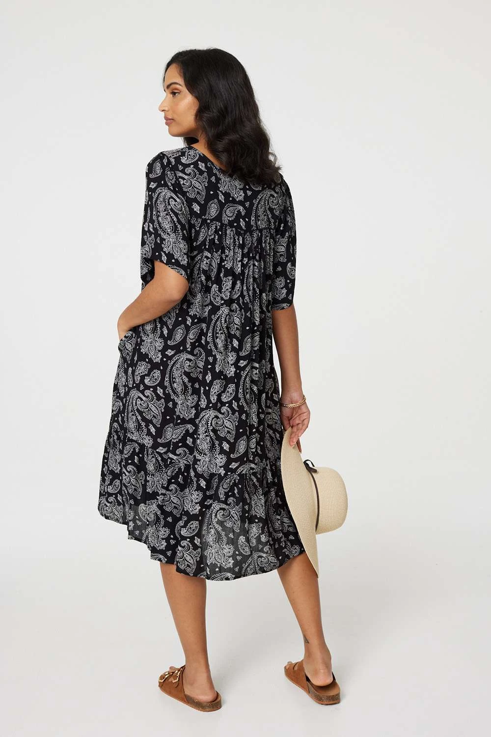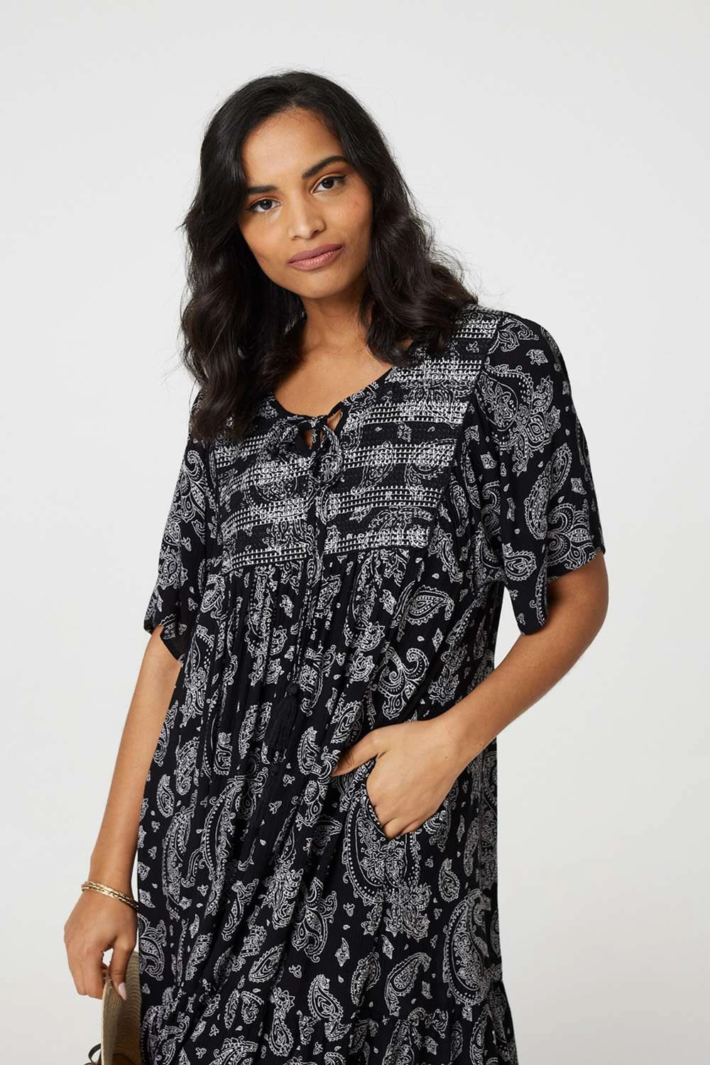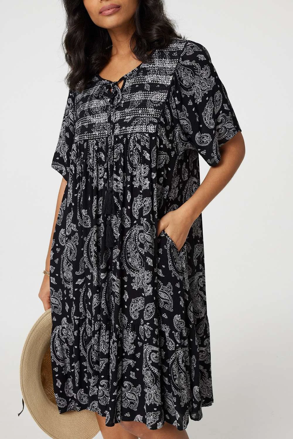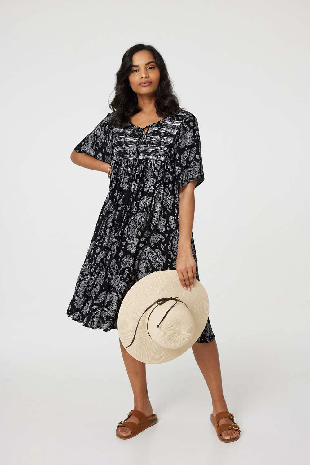 For an effortless and casual look, try this midi dress. It has a smocked top with a tie-up keyhole neck, along with 1/2 sleeves. The ruched front creates a relaxed look – and it even has pockets! Just add your favourite sandals or trainers.