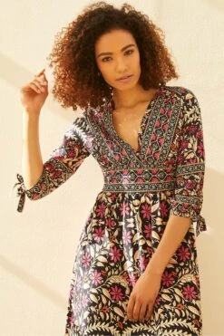 Add a statement paisley print to your warm weather wardrobe with this flattering maxi dress. Made from 100% viscose, it has a v-neck, 3/4 sleeves with a tie detail, an empire silhouette and a tiered maxi skirt with a soft high low effect. Pair with your favourite sandals or elevate the look with strappy heels for an essential addition to any holiday wardrobe.