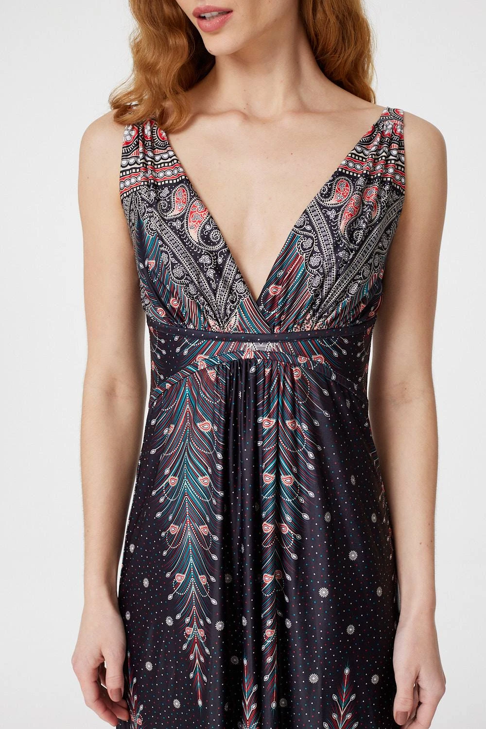 Every collection needs a statement a-line maxi dress like this peacock feather print dress. With a v-neck, wide cami straps, an empire waistband and a straight maxi length skirt. Pair with flat sandals for a bold yet versatile daytime look.