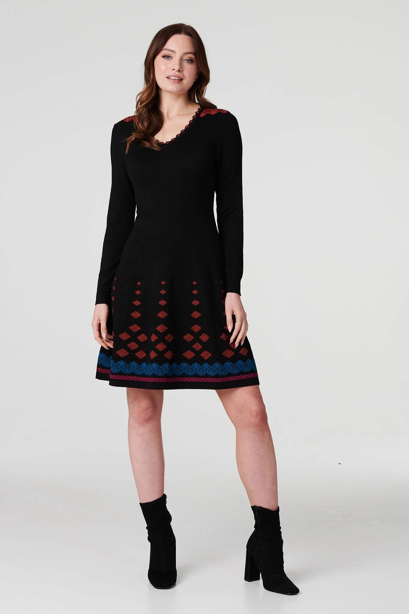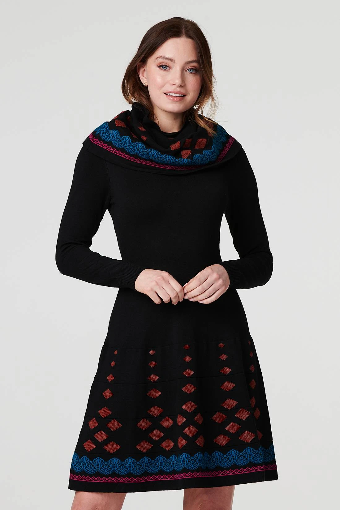 Make a statement in style with this soft skater knitted dress with a printed border hem. Featuring a round neck, a warm removable scarf, long sleeves, a fitted bodice and a knee length skater skirt. Style with tights and a pair of flat knee high boots for a comfortable daytime look.