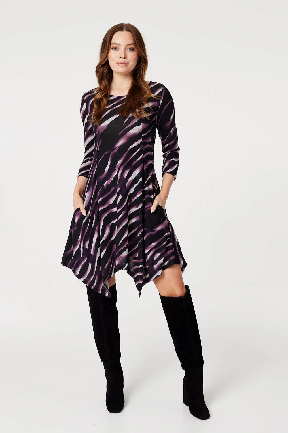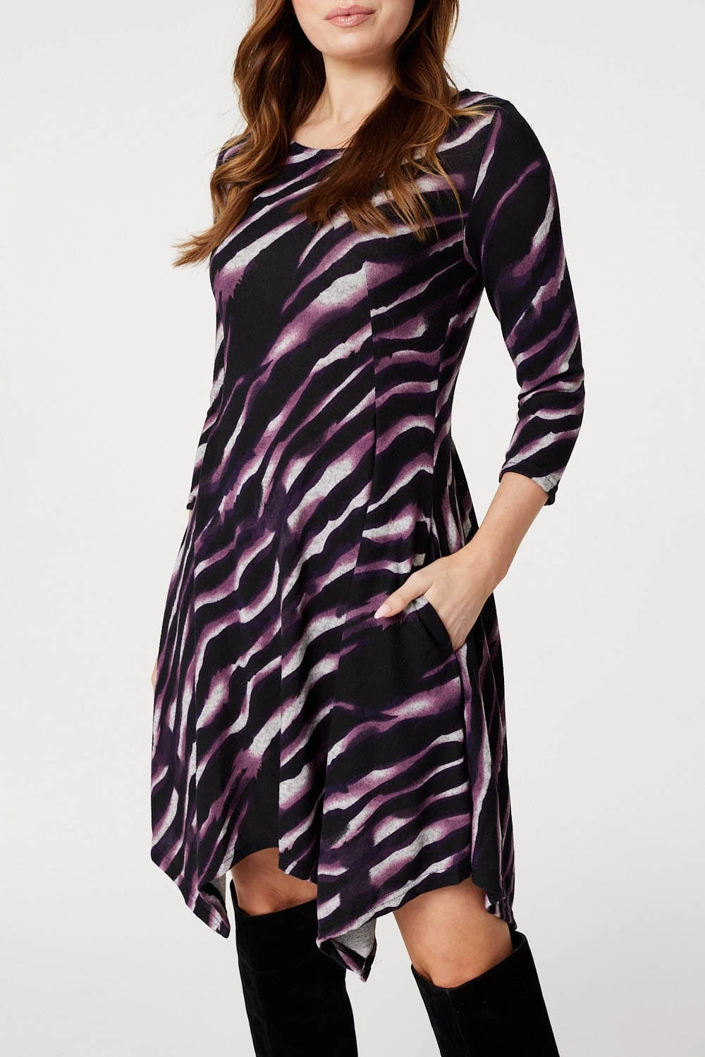 Add a go-to short dress to your closet with this printed fit & flare skater style. It has a round neck, 3/4 sleeves, a cinched waist and a short hanky-hemmed skirt sitting just above the knee. Pair with block heels or leather boots for a grab-and-go style that’s perfect for after-work drinks or dinner with friends.