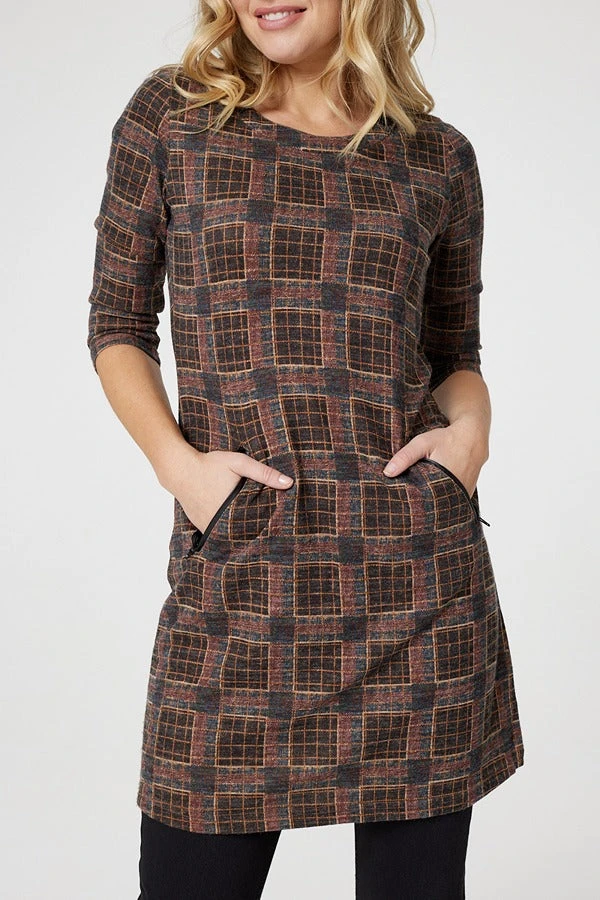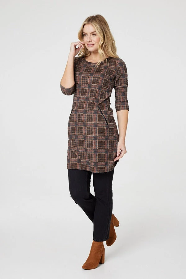 Add an easy-to-wear tunic shape to your dress collection with this elegant printed style. It has a round neck with a button detail, 3/4 sleeves, pockets, a fitted silhouette and a short length hem. Made in a comfortable brushed jersey fabric. Pair with opaque tights and boots for a standout daytime look.
