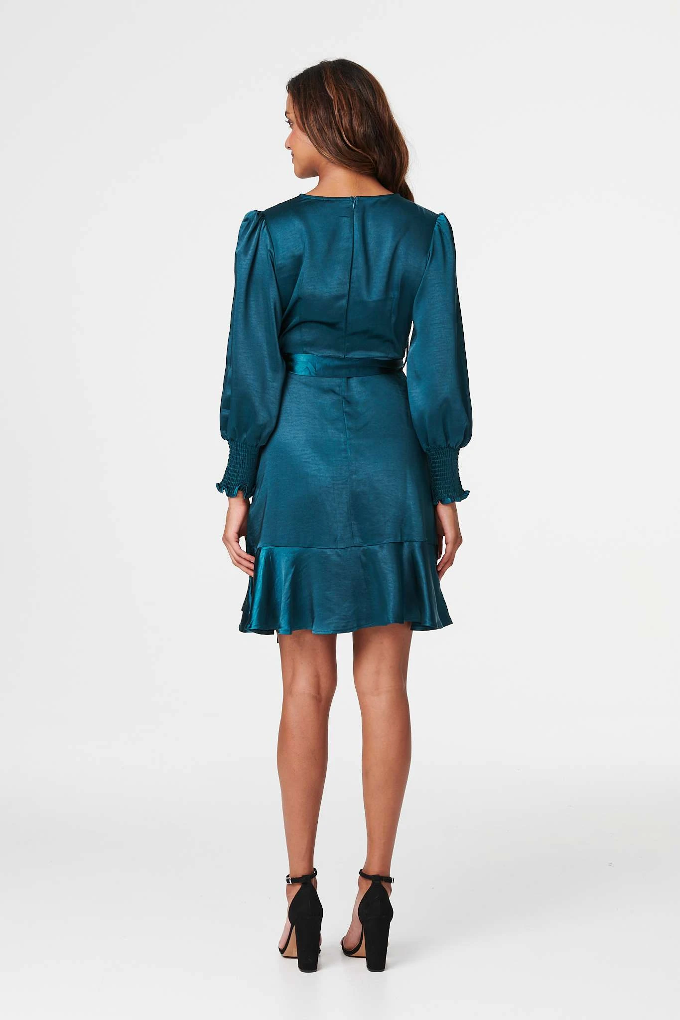 Add a short style to your dress collection with this frill detail wrap dress. It has a V-neck with a wrap front, a detachable self-tie belt, long sleeves with wide shirred cuffs and a frilled layered hem falling just above the knee. Pair with neutral heels for an elegant style that’s great for dinner out with friends.