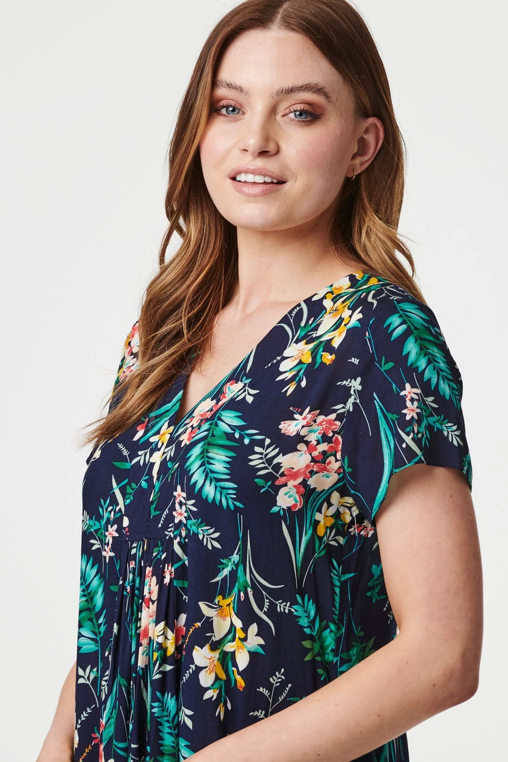 Add a bold tropical print shift dress to your closet with this relaxed look. With a v-neck, short sleeves, pockets and knee length skirt. Style with flat gladiator sandals for the ultimate in comfortable warm weather dressing.