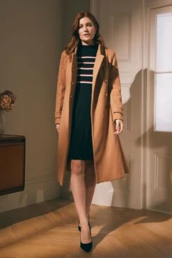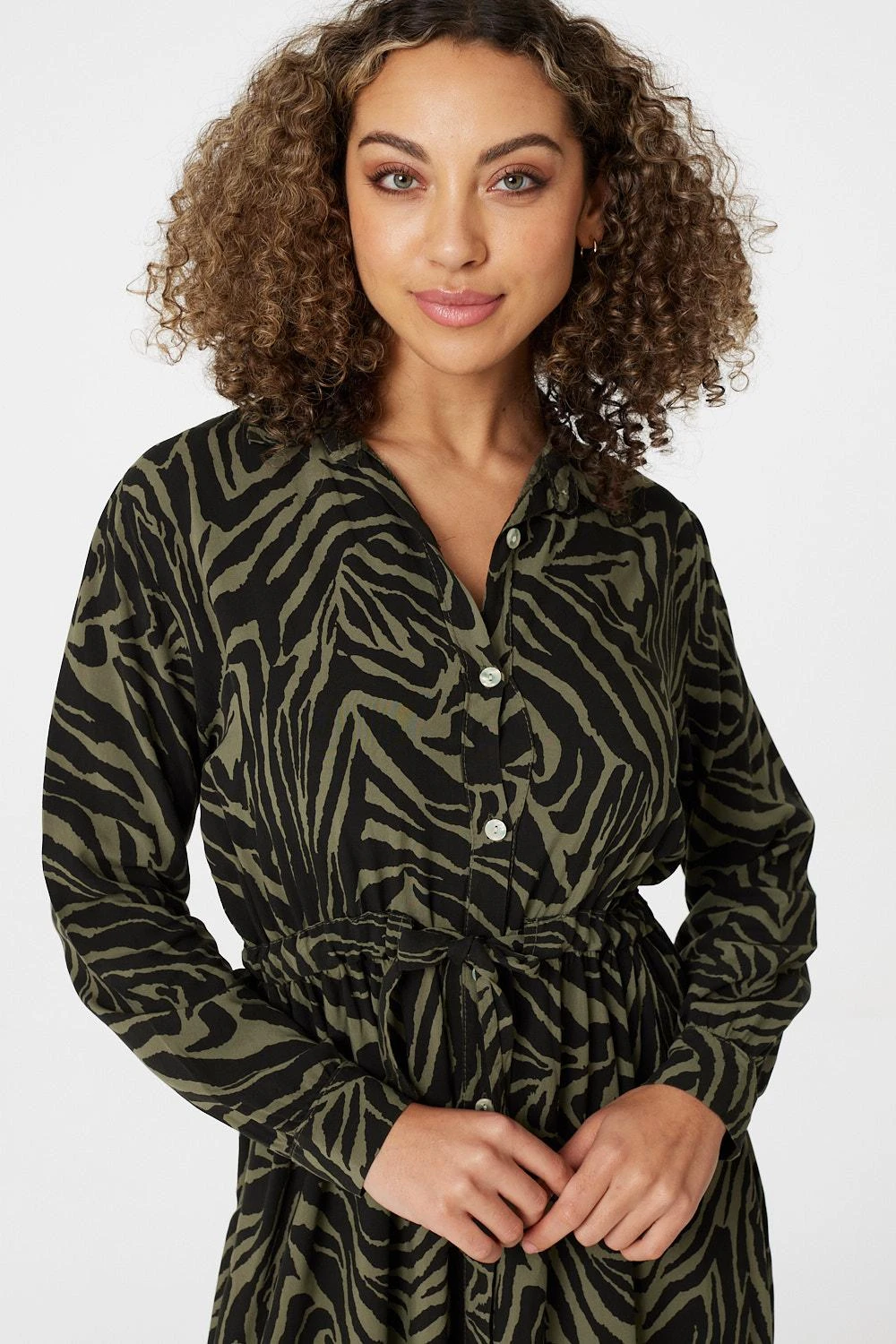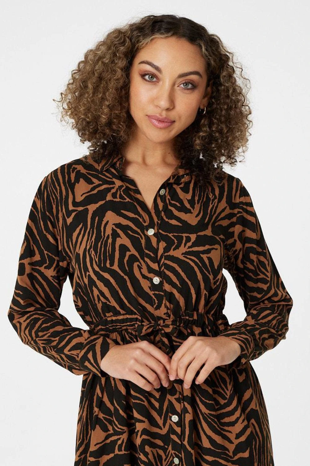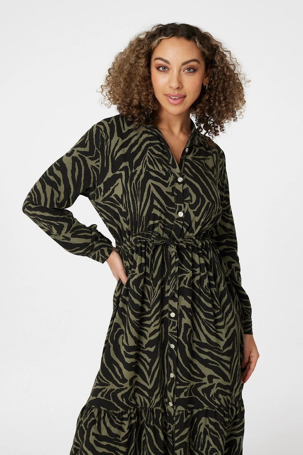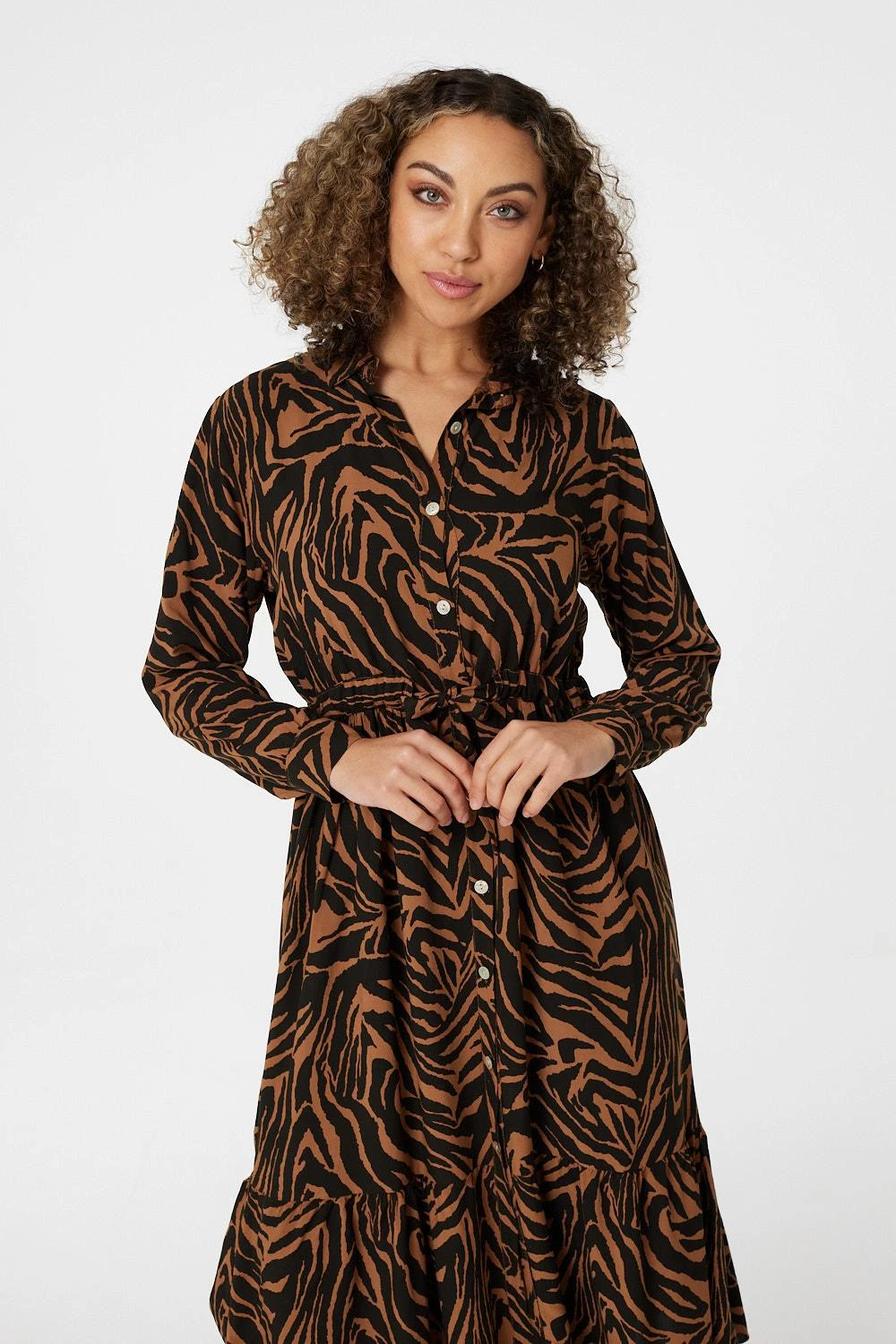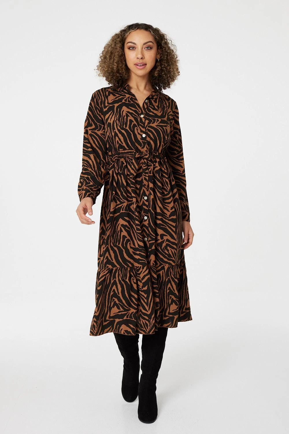 Add a bold printed shirt dress to your new season collection with this zebra print midi. With a v-neck, button front, cinched waist, long sleeves and a tiered a-line skirt sitting below the knee. Style with knee high boots and a faux fur coat for an effortless day to night outfit.